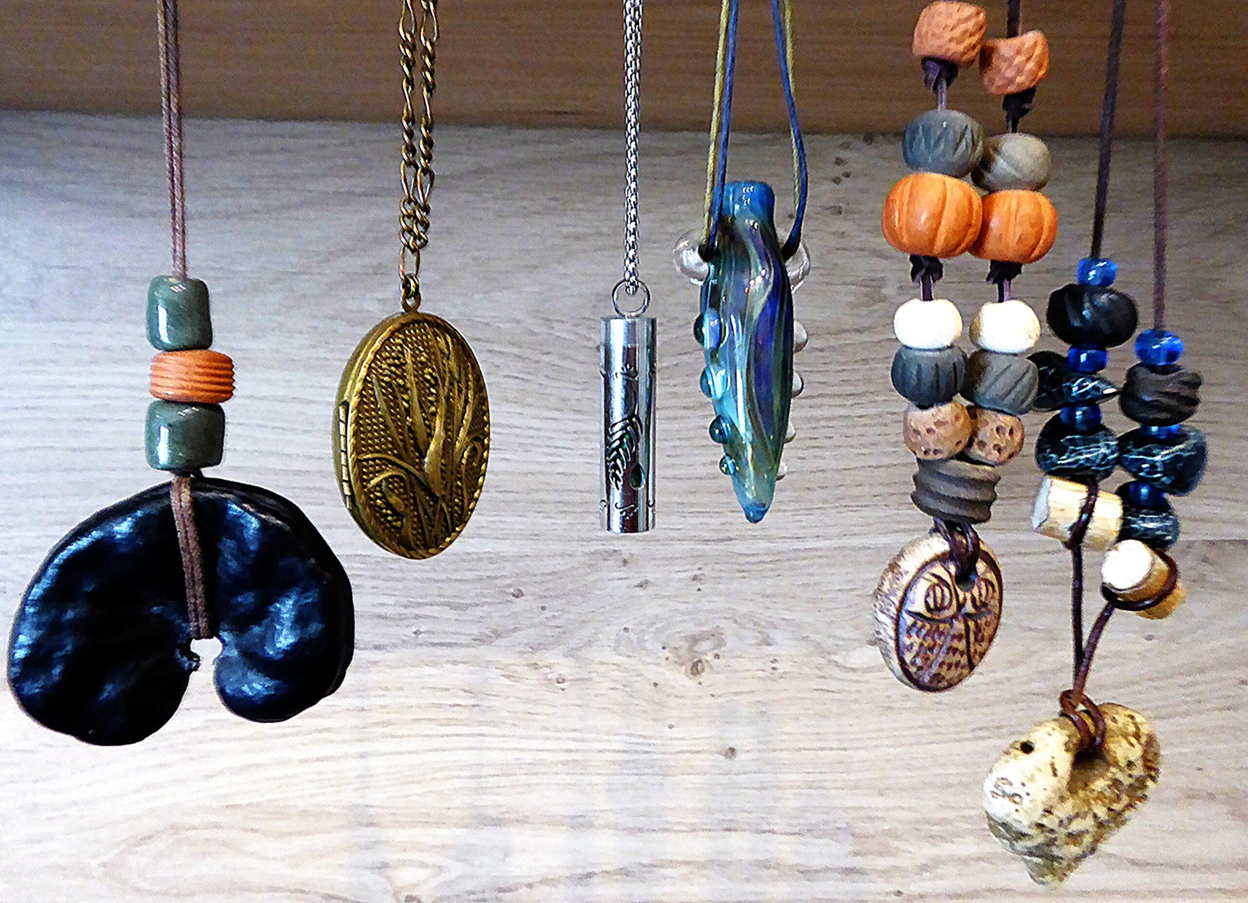 Moja omiljena mirisna ogrlica je multifunkcionalna. Osim perforiranog oblutka pronađenog na jadranskoj obali i keramičkih perli u bojama koje mi se sviđaju ima elemente napravljene od komadića suhih grančica. Oni su promjenjivi dio ogrlice i u nju se dodaju vezanjem. Kad poželim nositi neki drugi parfem jednostavno odvežem namirisane komadiće grančica i zamijenim ih čistim, nenamirisanim (imam ih pripremljenu punu zdjelicu), pa na njih kapnem novi parfem.